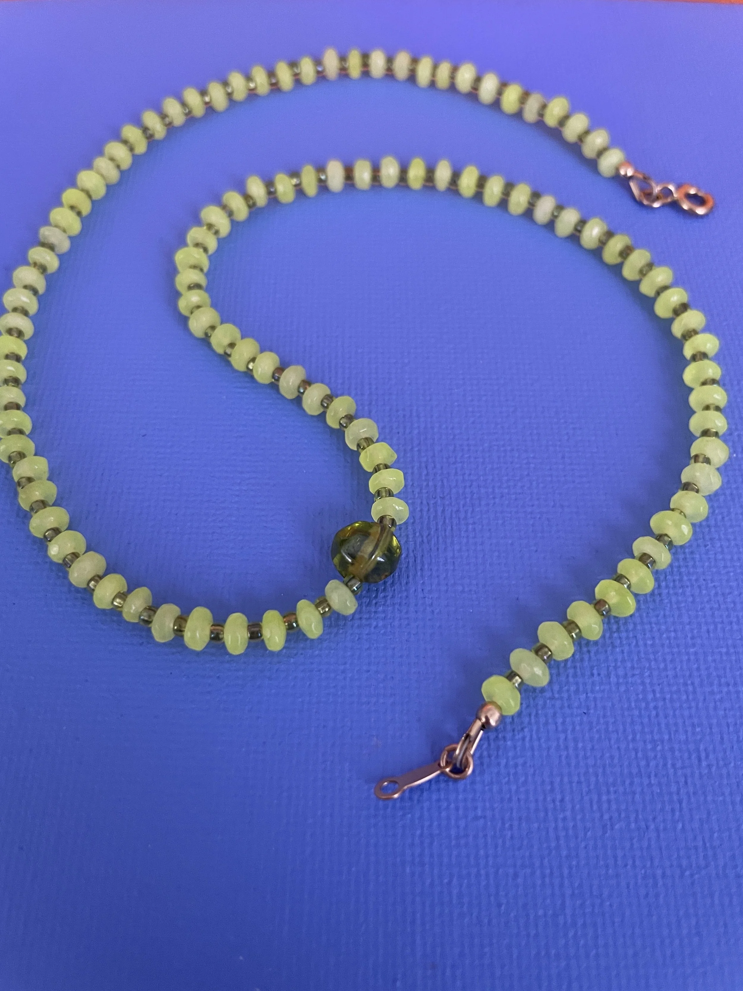 Necklace made with chartreuse faceted glass beads and an olive colored accent bead. Finished with a gold filled clasp.